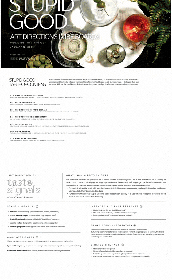 Every brand we work with has a why. Most have it buried under templates, stock language, and the version of themselves that was easier to sell. Our job is to dig it up, sharpen it, and build the system that lets it walk into every room ahead of you.