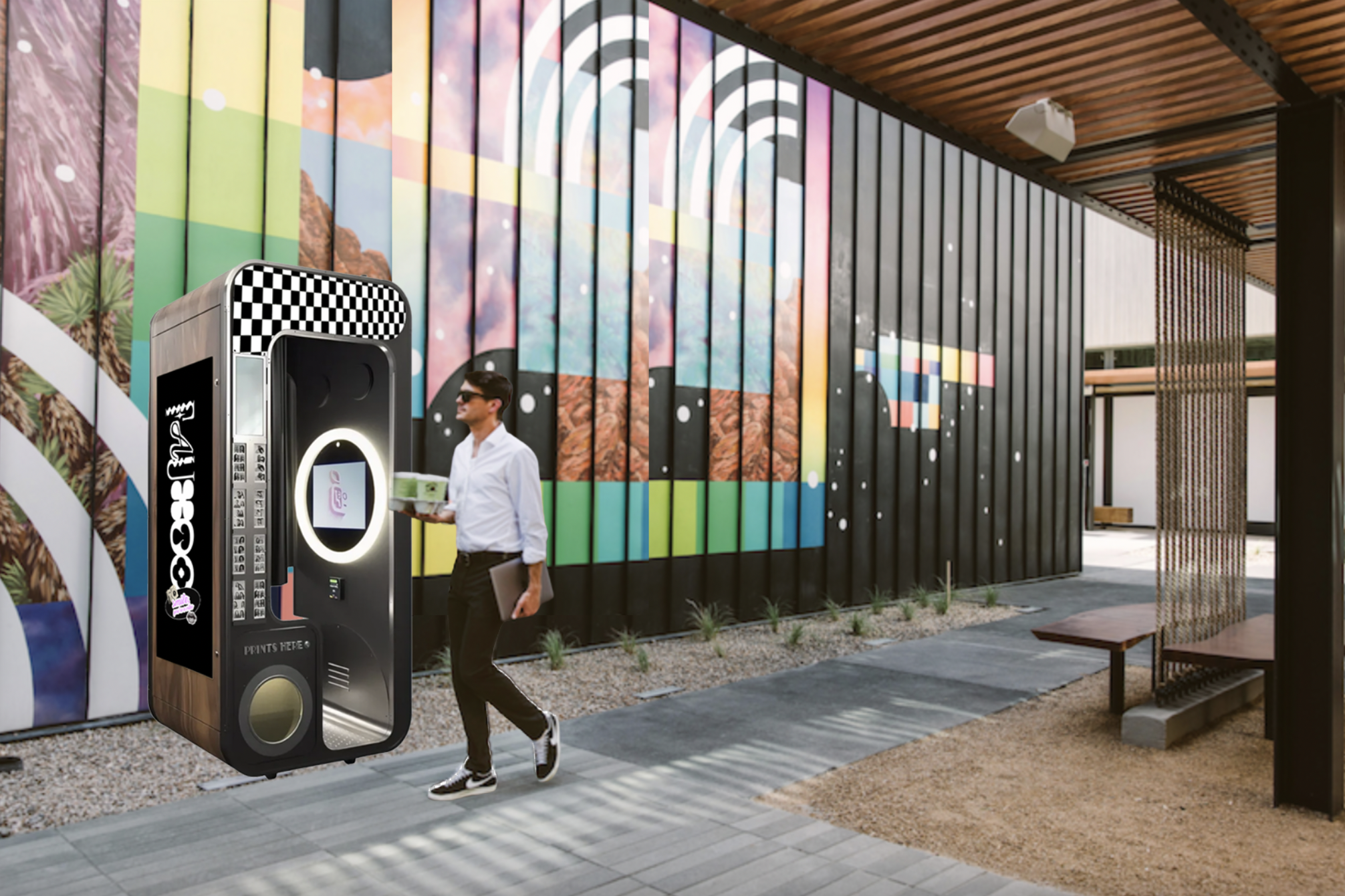 The 1st photo booth experience that's both IRL & URL — 4-frame printed strip, one blind-box charm dispensed in a capsule, clasps right to your print.